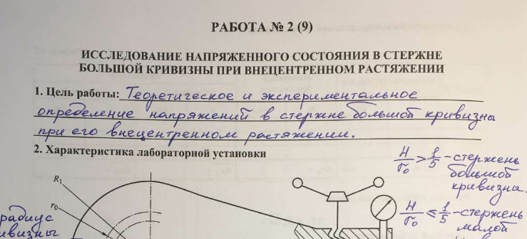 Лабораторная работа №9 - "Исследование напряженного состояния в стержне большой кривизны при внецентренном растяжении", зачтено ![]()