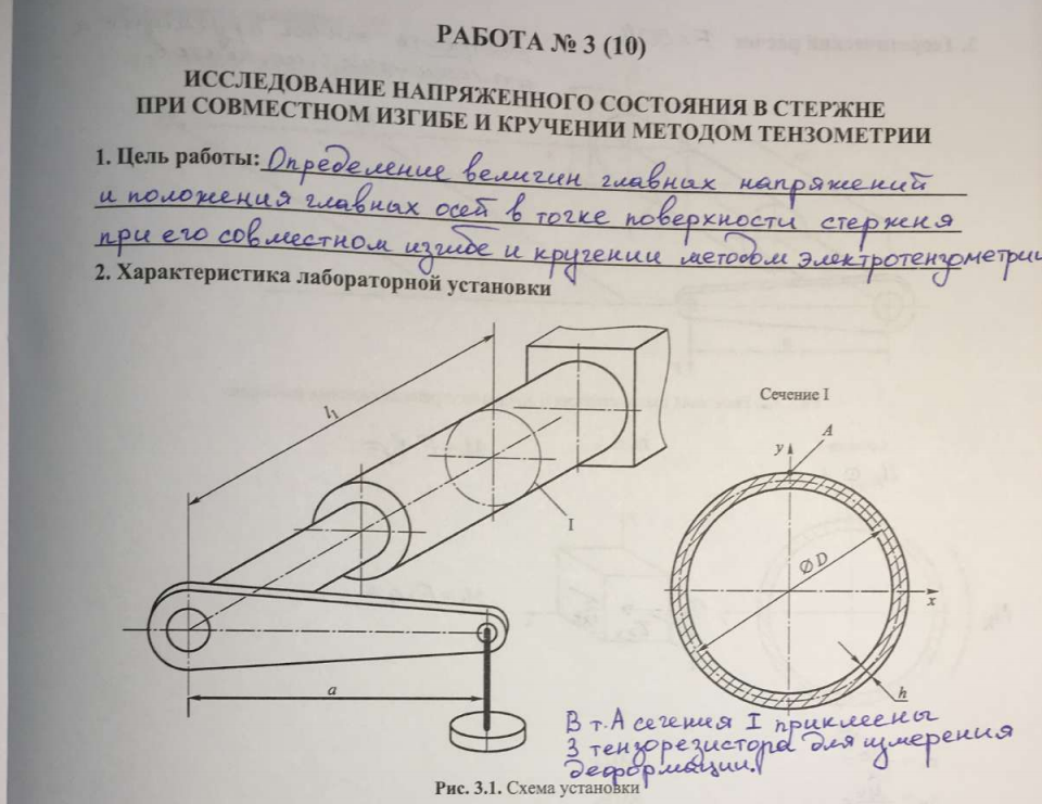 Лабораторная работа №10 "Исследование напряженного состояния в стержне при совместном изгибе и кручении методом тензометрии", зачтено