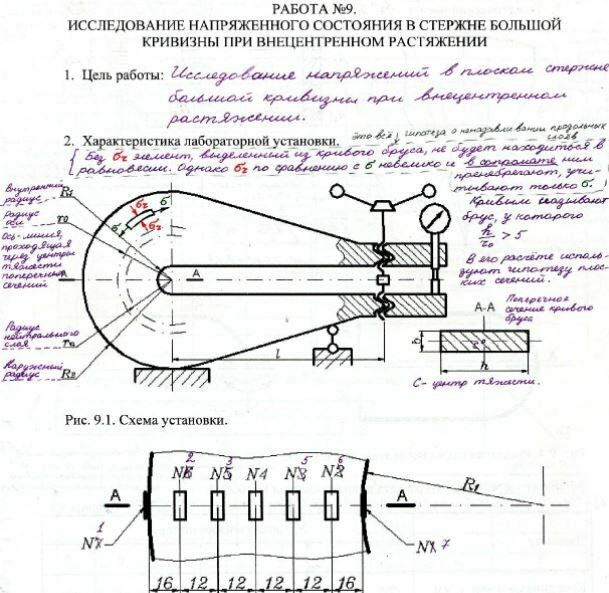 Лабораторная работа 9: Исследование напряженного состояния в стержне большой кривизны при внецентренном растяжении