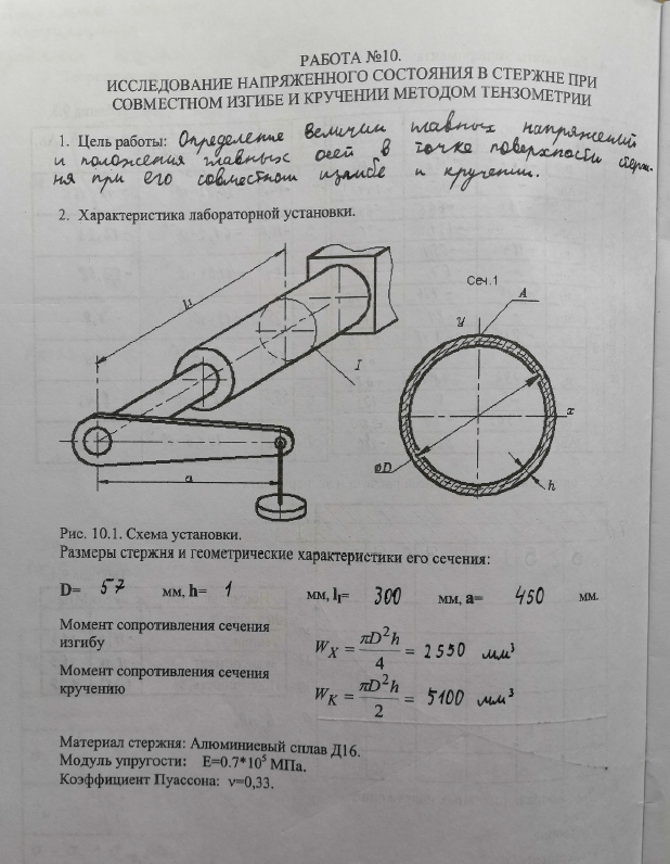 Лабораторная работа 10: Исследование напряженного состояния в стержне при совместном изгибе и кручении методом тензометрии