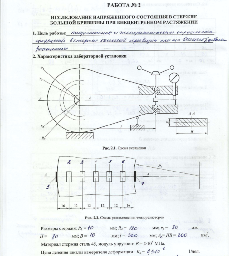 Лабораторная работа №9 - Исследование напряженного состояния в стержне большой кривизны при внецентренном растяжении. Зачтена.