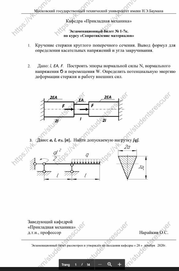 Для студентов МГТУ им. Н.Э.Баумана по предмету Сопротивление материаловЭкзамен - Билет 2020гЭкзамен - Билет 2020г