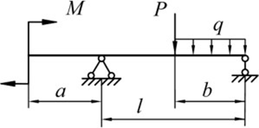 Размеры: l=2,1м; а=0,5м; b=0,8м; Нагрузка: Р=22кН; q=19 кН/м; Изгибающий момент: М=14кНм.