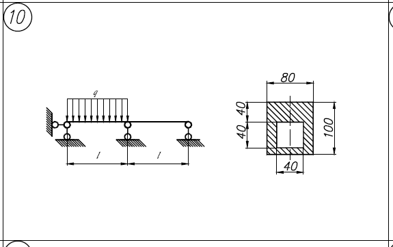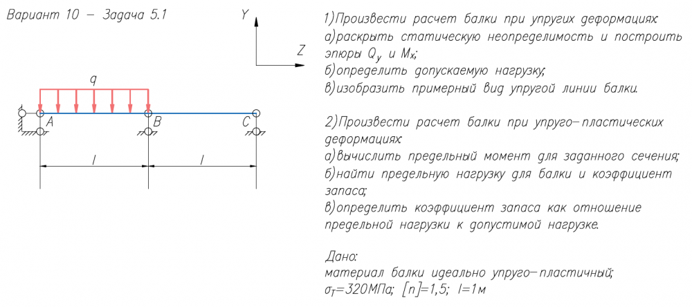 1)Произвести расчет балки при упругих деформациях: а)раскрыть статическую неопределимость и построить эпюры Q/y и M/x; б)определить допускаемую нагрузку; в)изобразить примерный вид упругой линии балки. 2)Произвести расчет балки при упруго-пластических деформациях: а)вычислить предельный момент для заданного сечения; б)найти предельную нагрузку для балки и коэффициент запаса; в)определить коэффициент запаса как отношение предельной нагрузки к допустимой нагрузке. Дано: материал балки идеально упруго-пластичный; σ/Т=320МПа; [n]=1,5; l=1м.