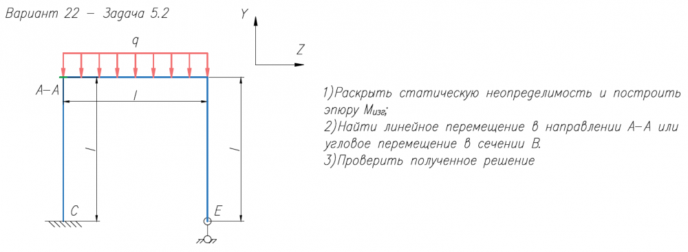 1)Раскрыть статическую неопределимость и построить эпюру M/изг; 2)Найти линейное перемещение в направлении А-А или угловое перемещение в сечении В. 3)Проверить полученное решение.