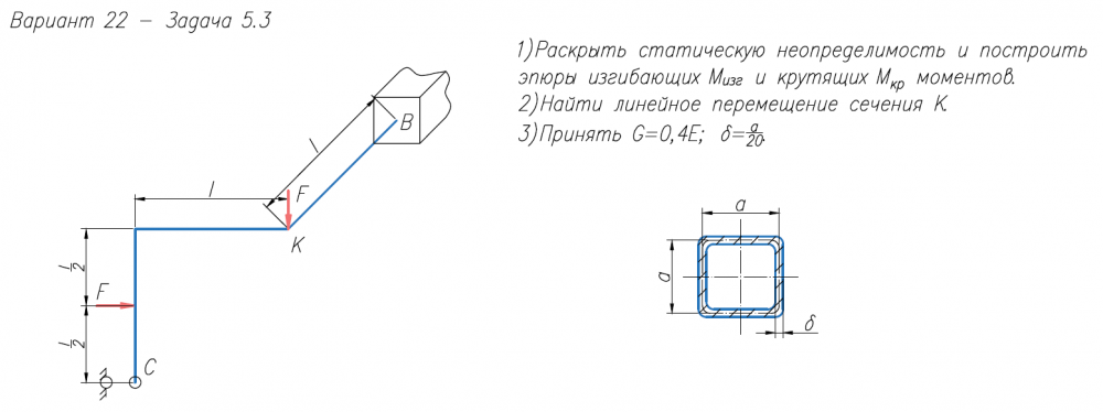 1)Раскрыть статическую неопределимость и построить эпюры изгибающих M/изг и крутящих M/кр моментов. 2)Найти линейное перемещение сечения К. 3)Принять G=0,4E.