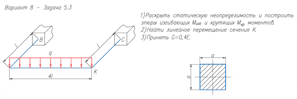 1)Раскрыть статическую неопределимость и построить эпюры изгибающих M/изг и крутящих M/кр моментов. 2)Найти линейное перемещение сечения К. 3)Принять G=0,4E.
