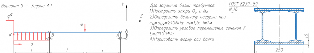 Для заданной балки требуется: 1)Построить эпюры Q/y и M/x. 2)Определить величину нагрузки при σ/Тр=σ/Тсж=240МПа; n/Т=1,5; l=1м 3)Определить угловое перемещение сечения К E=2*105/МПа 4)Нарисовать форму оси балки .