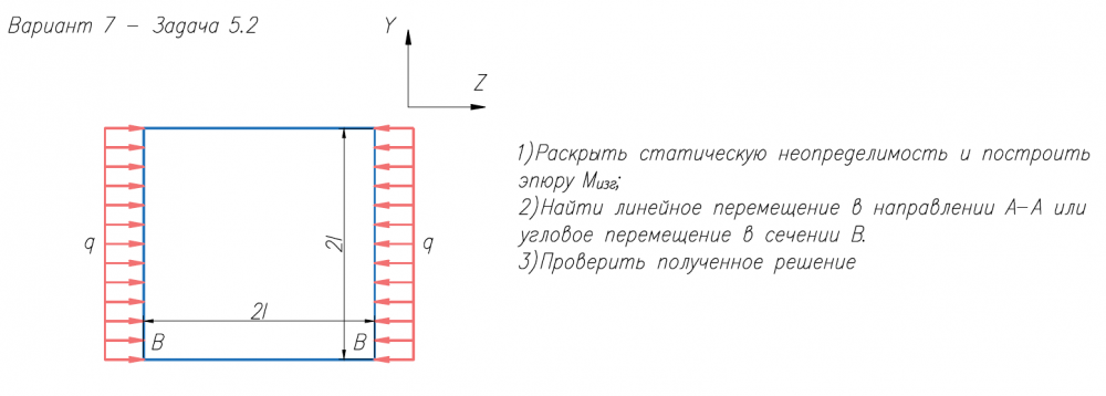 1)Раскрыть статическую неопределимость и построить эпюру M/изг; 2)Найти линейное перемещение в направлении А-А или угловое перемещение в сечении В. 3)Проверить полученное решение.