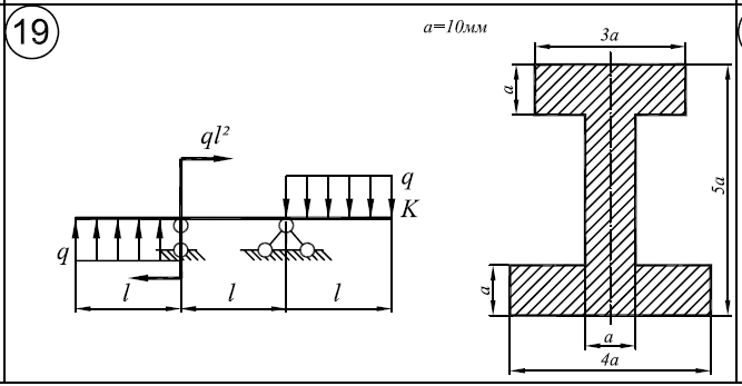 Для заданной балки требуется: 1)Построить эпюры Q/y и M/x. 2)Определить n/Т при q=10кН/м; l=0,4м; σ/Тр=σ/Тсж=320МПа. 3)Определить линейное перемещение сечения К E=2*105/МПа 4)Нарисовать форму оси балки .