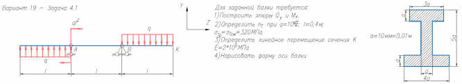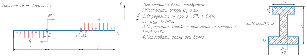 Для заданной балки требуется: 1)Построить эпюры Q/y и M/x. 2)Определить n/Т при q=10кН/м; l=0,4м; σ/Тр=σ/Тсж=320МПа. 3)Определить линейное перемещение сечения К E=2*105/МПа 4)Нарисовать форму оси балки .