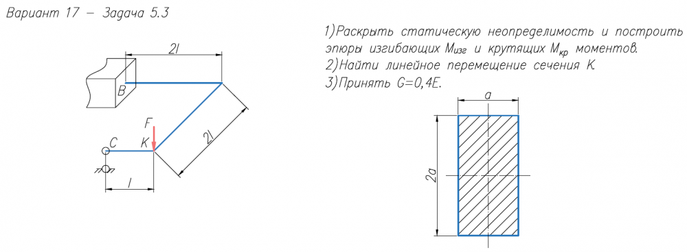 1)Раскрыть статическую неопределимость и построить эпюры изгибающих M/изг и крутящих M/кр моментов. 2)Найти линейное перемещение сечения К. 3)Принять G=0,4E.