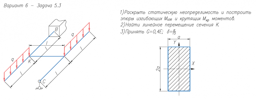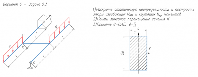 1)Раскрыть статическую неопределимость и построить эпюры изгибающих M/изг и крутящих M/кр моментов. 2)Найти линейное перемещение сечения К. 3)Принять G=0,4E.
