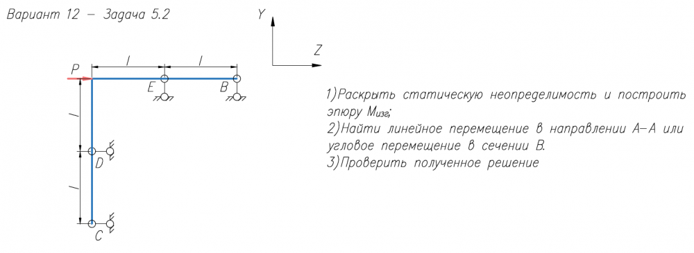 1)Раскрыть статическую неопределимость и построить эпюру M/изг; 2)Найти линейное перемещение в направлении А-А или угловое перемещение в сечении В. 3)Проверить полученное решение.