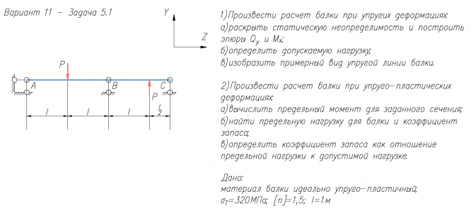1)Произвести расчет балки при упругих деформациях: а)раскрыть статическую неопределимость и построить эпюры Q/y и M/x; б)определить допускаемую нагрузку; в)изобразить примерный вид упругой линии балки. 2)Произвести расчет балки при упруго-пластических деформациях: а)вычислить предельный момент для заданного сечения; б)найти предельную нагрузку для балки и коэффициент запаса; в)определить коэффициент запаса как отношение предельной нагрузки к допустимой нагрузке. Дано: материал балки идеально упруго-пластичный; σ/Т=320МПа; [n]=1,5; l=1м.
