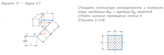 1)Раскрыть статическую неопределимость и построить эпюры изгибающих M/изг и крутящих M/кр моментов. 2)Найти линейное перемещение сечения К. 3)Принять G=0,4E.