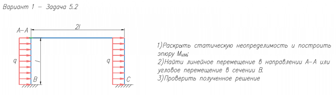 1)Раскрыть статическую неопределимость и построить эпюру M/изг; 2)Найти линейное перемещение в направлении А-А или угловое перемещение в сечении В. 3)Проверить полученное решение.