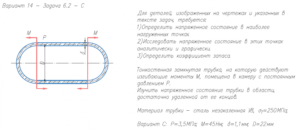 Задача 6.2 Для деталей, изображенных на чертежах и указанных в тексте задач, требуется: 1)Определить напряженное состояние в наиболее нагруженных точках. 2)Исследовать напряженное состояние в этих точках аналитически и графически. 3)Определить коэффициент запаса. Тонкостенная замкнутая трубка, на которую действуют изгибающие моменты M, помещена в камеру с постоянным давлением P. Изучить напряженное состояние трубки в области, достаточно удаленной от ее концов. Материал трубки - сталь незакаленная У8, σ/Т=250МПа; Вариант C: P=3,5МПа; M=45Нм; δ=1,1мм; D=22мм.