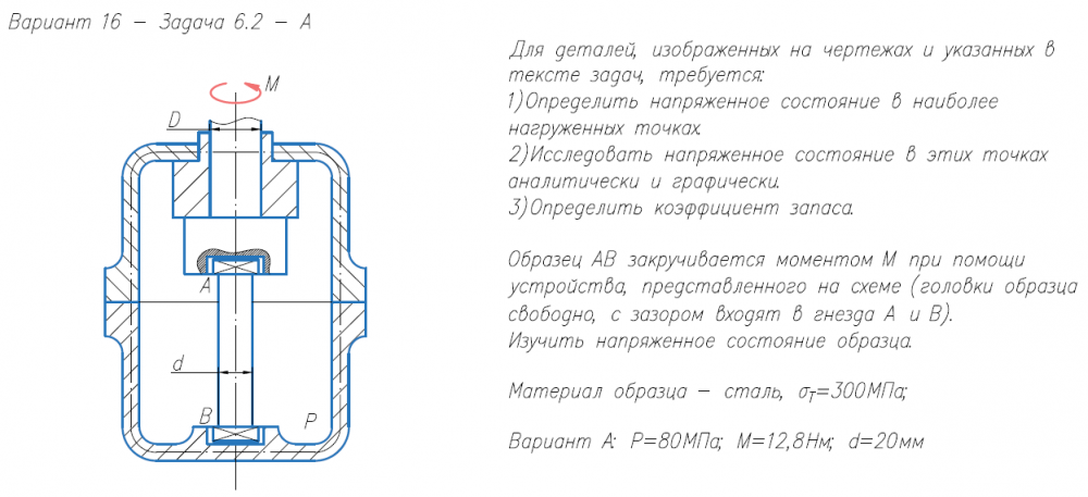 Задача 6.2. Для деталей, изображенных на чертежах и указанных в тексте задач, требуется: 1)Определить напряженное состояние в наиболее нагруженных точках. 2)Исследовать напряженное состояние в этих точках аналитически и графически. 3)Определить коэффициент запаса. Образец AB закручивается моментом M при помощи устройства, представленного на схеме (головки образца свободно, с зазором входят в гнезда A и B). Изучить напряженное состояние образца. Материал образца - сталь, σ/Т=300МПа; Вариант А: P=80МПа; M=12,8Нм; d=20мм.