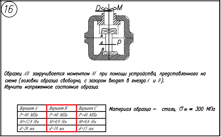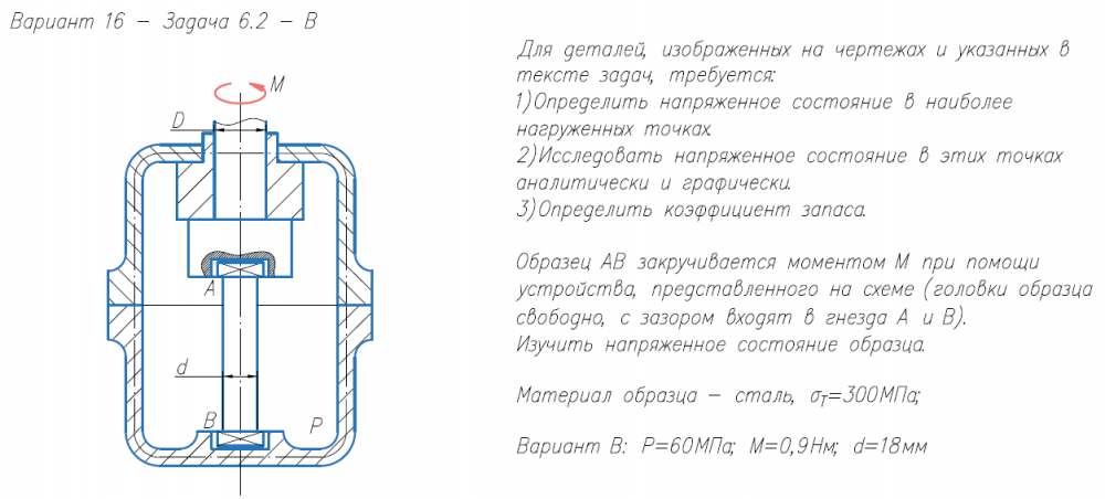 Задача 6.2. Для деталей, изображенных на чертежах и указанных в тексте задач, требуется: 1)Определить напряженное состояние в наиболее нагруженных точках. 2)Исследовать напряженное состояние в этих точках аналитически и графически. 3)Определить коэффициент запаса. Образец AB закручивается моментом M при помощи устройства, представленного на схеме (головки образца свободно, с зазором входят в гнезда A и B). Изучить напряженное состояние образца. Материал образца - сталь, σ/Т=300МПа; Вариант B: P=60МПа; M=0,9Нм; d=18мм.