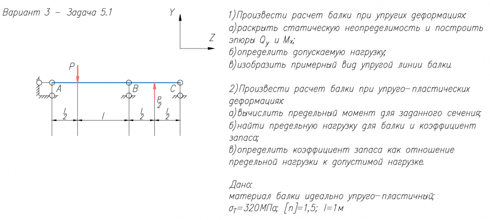 1)Произвести расчет балки при упругих деформациях: а)раскрыть статическую неопределимость и построить эпюры Q/y и M/x; б)определить допускаемую нагрузку; в)изобразить примерный вид упругой линии балки. 2)Произвести расчет балки при упруго-пластических деформациях: а)вычислить предельный момент для заданного сечения; б)найти предельную нагрузку для балки и коэффициент запаса; в)определить коэффициент запаса как отношение предельной нагрузки к допустимой нагрузке. Дано: материал балки идеально упруго-пластичный; σ/Т=320МПа; [n]=1,5; l=1м.