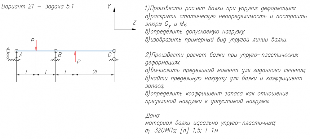 1)Произвести расчет балки при упругих деформациях: а)раскрыть статическую неопределимость и построить эпюры Q/y и M/x; б)определить допускаемую нагрузку; в)изобразить примерный вид упругой линии балки. 2)Произвести расчет балки при упруго-пластических деформациях: а)вычислить предельный момент для заданного сечения; б)найти предельную нагрузку для балки и коэффициент запаса; в)определить коэффициент запаса как отношение предельной нагрузки к допустимой нагрузке. Дано: материал балки идеально упруго-пластичный; σ/Т=320МПа; [n]=1,5; l=1м.