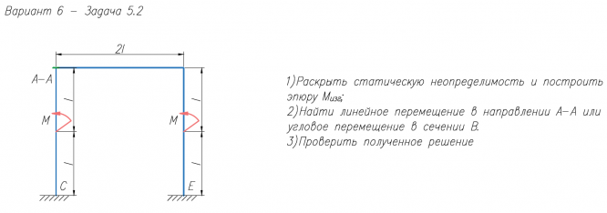 1)Раскрыть статическую неопределимость и построить эпюру M/изг; 2)Найти линейное перемещение в направлении А-А или угловое перемещение в сечении В. 3)Проверить полученное решение.