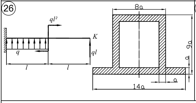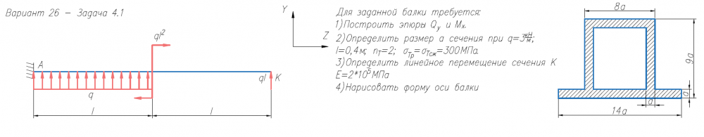 Для заданной балки требуется: 1)Построить эпюры Q/y и M/x. 2)Определить размер а сечения при q=3кН/м; l=0,4м; n/Т=2; σ/Тр=σ/Тсж=300МПа. 3)Определить линейное перемещение сечения К E=2*105/МПа 4)Нарисовать форму оси балки .