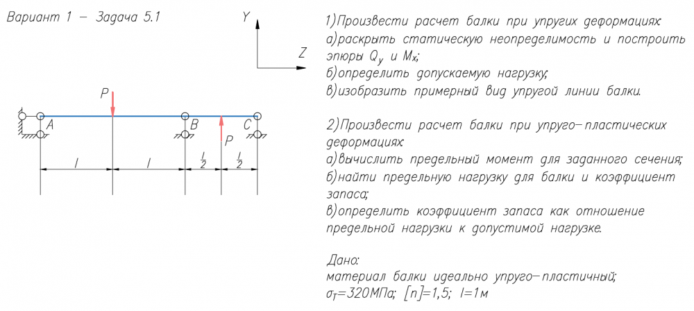 1)Произвести расчет балки при упругих деформациях: а)раскрыть статическую неопределимость и построить эпюры Q/y и M/x; б)определить допускаемую нагрузку; в)изобразить примерный вид упругой линии балки. 2)Произвести расчет балки при упруго-пластических деформациях: а)вычислить предельный момент для заданного сечения; б)найти предельную нагрузку для балки и коэффициент запаса; в)определить коэффициент запаса как отношение предельной нагрузки к допустимой нагрузке. Дано: материал балки идеально упруго-пластичный; σ/Т=320МПа; [n]=1,5; l=1м.