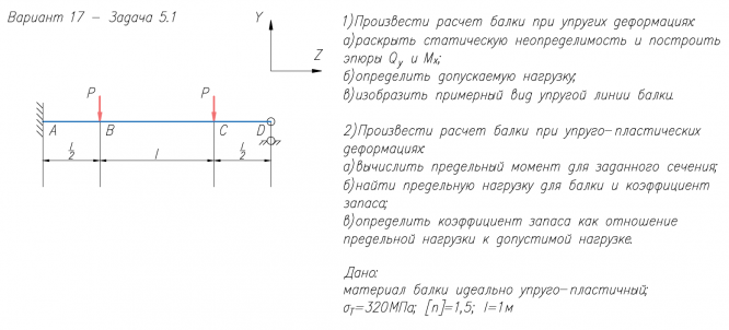 1)Произвести расчет балки при упругих деформациях: а)раскрыть статическую неопределимость и построить эпюры Q/y и M/x; б)определить допускаемую нагрузку; в)изобразить примерный вид упругой линии балки. 2)Произвести расчет балки при упруго-пластических деформациях: а)вычислить предельный момент для заданного сечения; б)найти предельную нагрузку для балки и коэффициент запаса; в)определить коэффициент запаса как отношение предельной нагрузки к допустимой нагрузке. Дано: материал балки идеально упруго-пластичный; σ/Т=320МПа; [n]=1,5; l=1м.