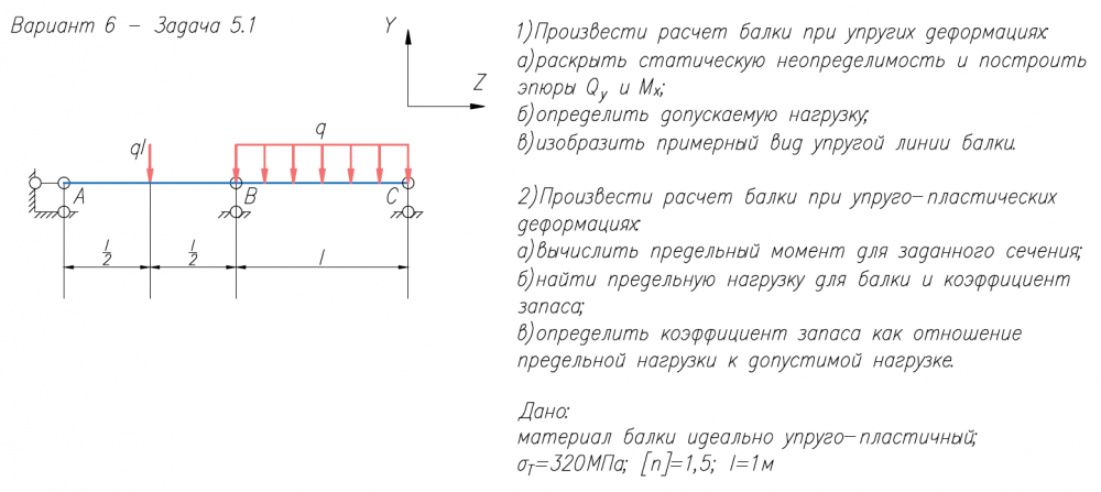 1)Произвести расчет балки при упругих деформациях: а)раскрыть статическую неопределимость и построить эпюры Q/y и M/x; б)определить допускаемую нагрузку; в)изобразить примерный вид упругой линии балки. 2)Произвести расчет балки при упруго-пластических деформациях: а)вычислить предельный момент для заданного сечения; б)найти предельную нагрузку для балки и коэффициент запаса; в)определить коэффициент запаса как отношение предельной нагрузки к допустимой нагрузке. Дано: материал балки идеально упруго-пластичный; σ/Т=320МПа; [n]=1,5; l=1м.
