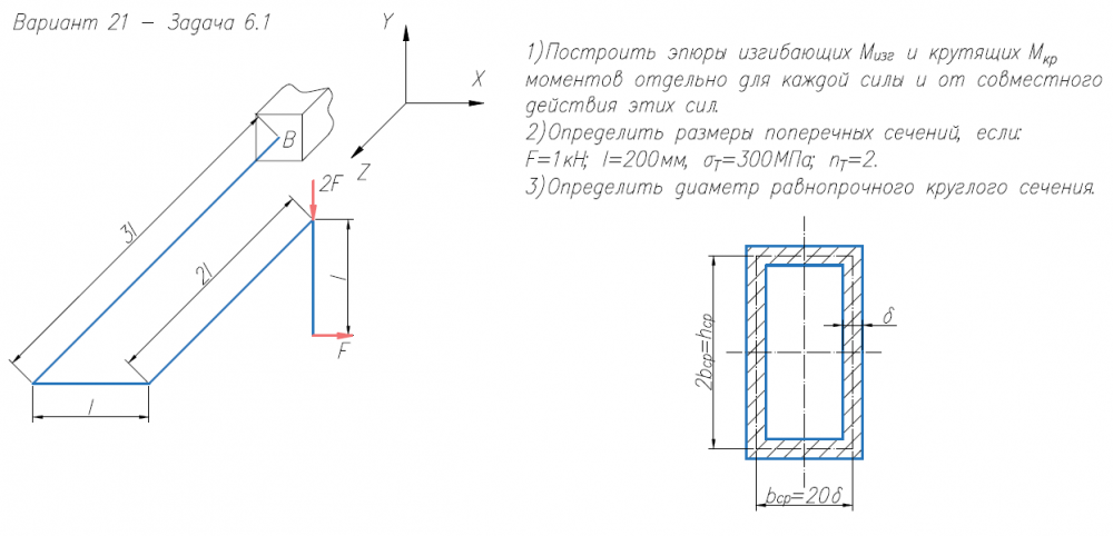 Задача 6.1 Построить эпюры изгибающих M/изг и крутящих M/кр моментов отдельно для каждой силы и от совместного действия этих сил. 2)Определить размеры поперечных сечений, если: F=1кН; l=200мм, σ/Т=300МПа; n/Т=2. 3)Определить диаметр равнопрочного круглого сечения..