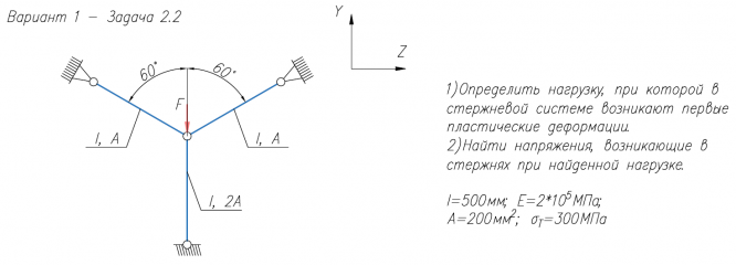 1)Определить нагрузку, при которой в стержневой системе возникают первые пластические деформации. 2)Найти напряжения, возникающие в стержнях при найденной нагрузке. l=500мм; E=2*105/МПа; A=200мм2/; σ/Т=300МПа .
