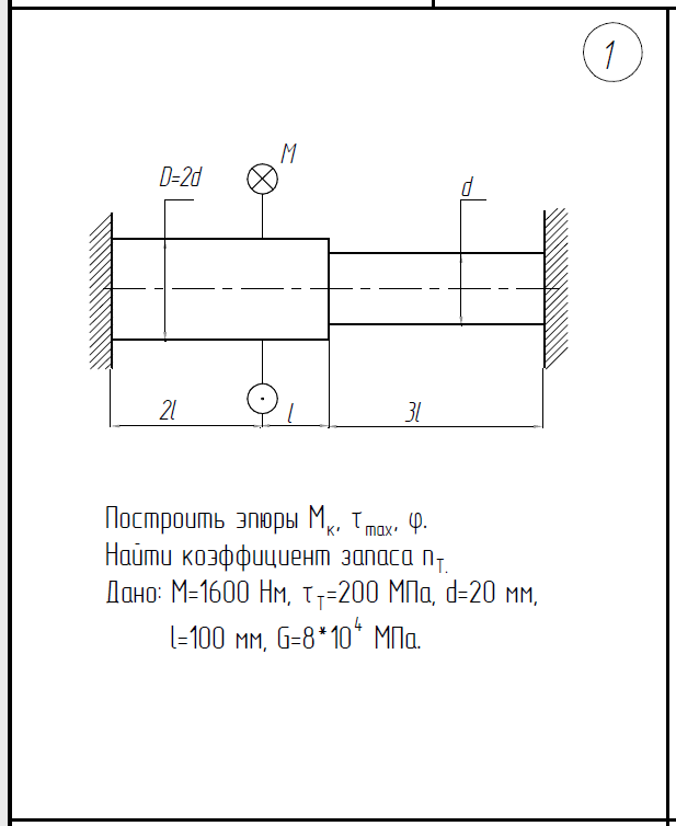1)Построить эпюры М/к, τ/max, φ 2)Найти коэффициент запаса n/Т М=1600Нм; τ/Т=200МПа; d=20мм; l=100мм; G=8*104/МПа .