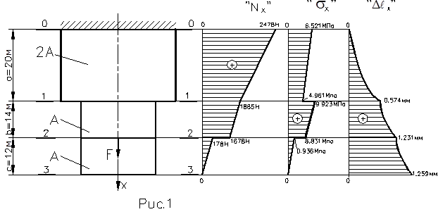 Стальной стержень находится под действием продольной силы F и собственного веса (рис. 1). Необходимо построить эпюры нормальных сил, нормальных напряжений и перемещений поперечных сечений стержня относительно закрепления. Показать в задании определе