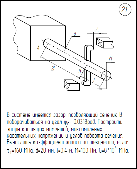 В системе имеется зазор, позволяющий сечению В поворачиваться на угол φ/С=0,0318рад. Построить эпюры М/к, τ/max, φ Вычислить коэффициент запаса по текучести, если: τ/Т=160МПа; d=20мм; l=0,4м=400мм; М=100Нм; G=8*104/МПа.