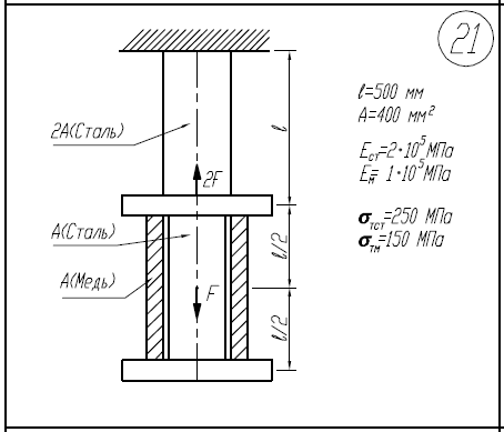 1)Определить силу F, при которой в системе возникнут первые пластические деформации. 2)Построить эпюры N,σ,w для стержня и трубки при этом значении силы F. l=500мм; A=400мм2/; E/ст=2*105/МПа; E/м=1*105/МПа; σ/тст=250МПа; σ/тм=150МПа .