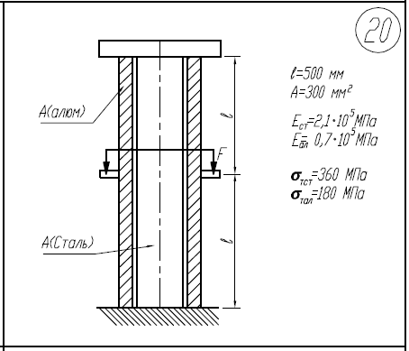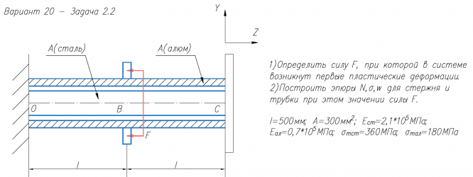 1)Определить силу F, при которой в системе возникнут первые пластические деформации. 2)Построить эпюры N,σ,w для стержня и трубки при этом значении силы F. l=500мм; A=300мм2/; E/ст=2,1*105/МПа; E/ал=0,7*105/МПа; σ/тст=360МПа; σ/тал=180МПа.