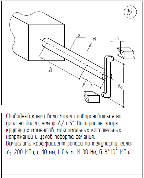 Свободный конец вала может поворачиваться на угол не более, чем φ=Δ/h=5°. Построить эпюры М/к, τ/max, φ Вычислить коэффициент запаса по текучести, если: τ/Т=200МПа; d=10мм; l=0,4м=400мм; М=30Нм; G=8*104/МПа .
