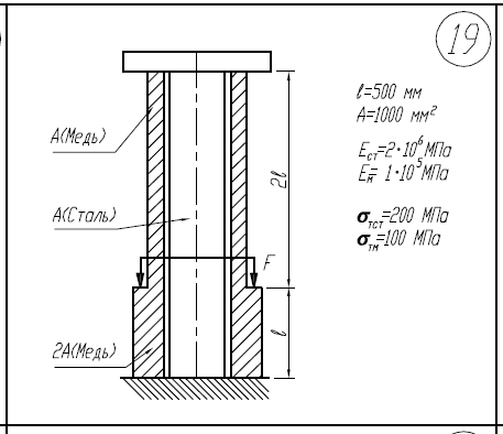 1)Определить силу F, при которой в системе возникнут первые пластические деформации. 2)Построить эпюры N,σ,w для стержня и трубки при этом значении силы F. l=500мм; A=1000мм2/; E/ст=2*105/МПа; E/м=1*105/МПа; σ/тст=200МПа; σ/тм=100МПа .