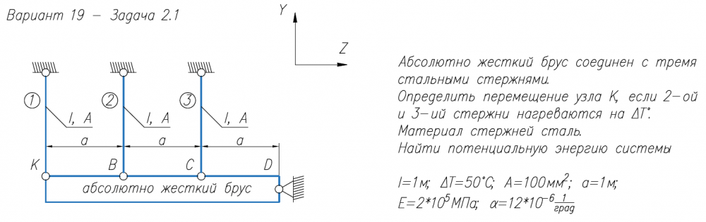 Абсолютно жесткий брус соединен с тремя стальными стержнями. Определить перемещение узла К, если 2-ой и 3-ий стержни нагреваются на ΔT°. Материал стержней сталь. Найти потенциальную энергию системы l=1м; ΔT=50°С; A=100мм2/; a=1м; E=2*105/МПа; α=12*10-6/1/град .