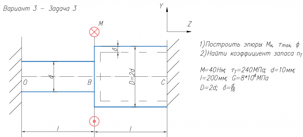 1)Построить эпюры М/к, τ/max, φ 2)Найти коэффициент запаса n/Т М=40Нм; τ/Т=240МПа; d=10мм; l=200мм; G=8*104/МПа D=2d; δ=d/16   .