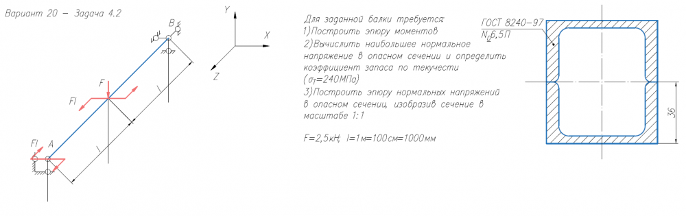 Для заданной балки требуется: 1)Построить эпюру моментов 2)Вычислить наибольшее нормальное напряжение в опасном сечении и определить коэффициент запаса по текучести (σ/Т=240МПа) 3)Построить эпюру нормальных напряжений в опасном сечении, изобразив сечение в масштабе 1:1.