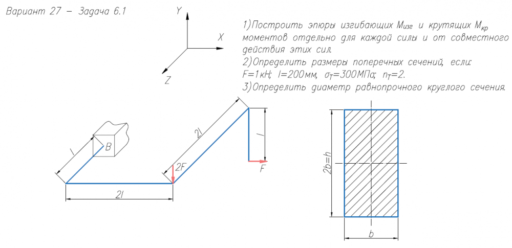 Задача 6.1 Построить эпюры изгибающих M/изг и крутящих M/кр моментов отдельно для каждой силы и от совместного действия этих сил. 2)Определить размеры поперечных сечений, если: F=1кН; l=200мм, σ/Т=300МПа; n/Т=2. 3)Определить диаметр равнопрочного круглого сечения..