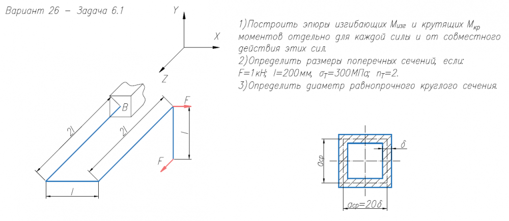 Задача 6.1 Построить эпюры изгибающих M/изг и крутящих M/кр моментов отдельно для каждой силы и от совместного действия этих сил. 2)Определить размеры поперечных сечений, если: F=1кН; l=200мм, σ/Т=300МПа; n/Т=2. 3)Определить диаметр равнопрочного круглого сечения..