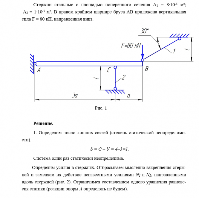 Главная » Учебные материалы » Сопротивление материалов » Решения задач » Несколько классов/семестров » Жесткий брус, весом и деформацией которого можно пренебречь, при-креплен к неподвижной опоре и двум стержням при помощи шарниров. Определить напряжения в стержнях при следующих данных