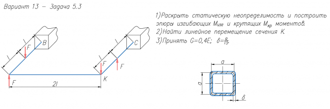 1)Раскрыть статическую неопределимость и построить эпюры изгибающих M/изг и крутящих M/кр моментов. 2)Найти линейное перемещение сечения К. 3)Принять G=0,4E.