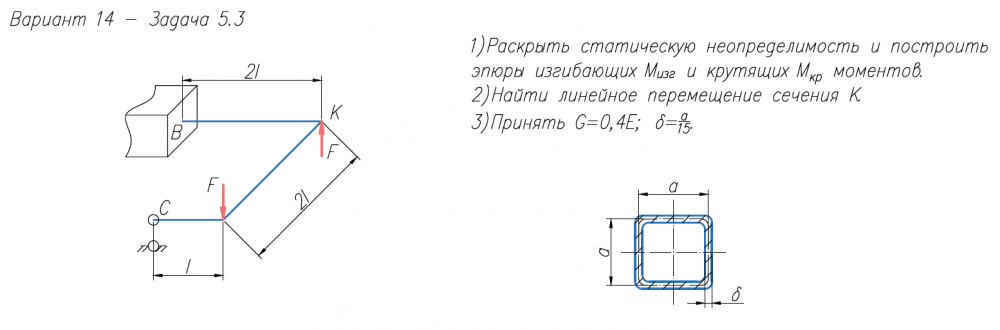 1)Раскрыть статическую неопределимость и построить эпюры изгибающих M/изг и крутящих M/кр моментов. 2)Найти линейное перемещение сечения К. 3)Принять G=0,4E.