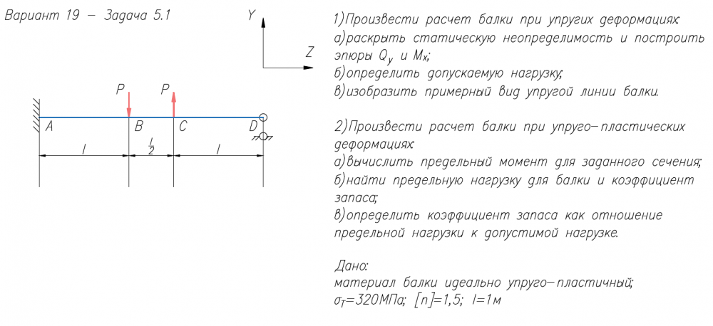 1)Произвести расчет балки при упругих деформациях: а)раскрыть статическую неопределимость и построить эпюры Q/y и M/x; б)определить допускаемую нагрузку; в)изобразить примерный вид упругой линии балки. 2)Произвести расчет балки при упруго-пластических деформациях: а)вычислить предельный момент для заданного сечения; б)найти предельную нагрузку для балки и коэффициент запаса; в)определить коэффициент запаса как отношение предельной нагрузки к допустимой нагрузке. Дано: материал балки идеально упруго-пластичный; σ/Т=320МПа; [n]=1,5; l=1м.