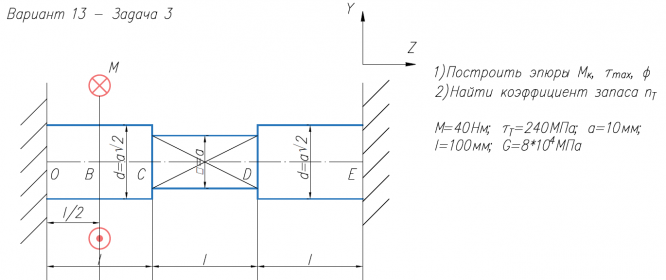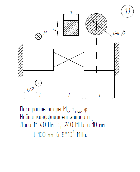 1)Построить эпюры М/к, τ/max, φ 2)Найти коэффициент запаса n/Т М=40Нм; τ/Т=240МПа; a=10мм; l=100мм; G=8*104/МПа.